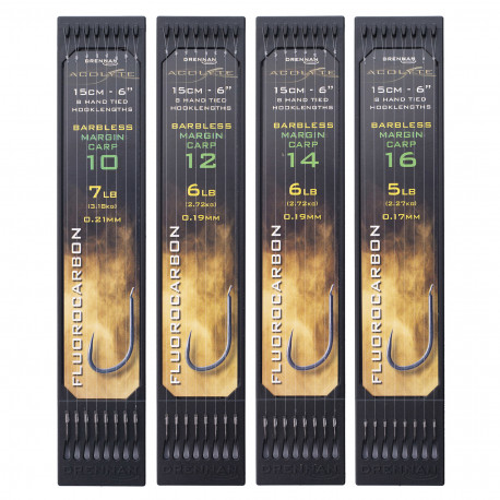 Los anzuelos Margin Carp son fuertes y fiables, perfectos para cebos más grandes como pellets, maíz, carne y gusanos para capturar grandes carpas. Tamaño 10 montado en 0.21mm (7lb). Tamaño 12 montado en 0,19mm (6lb). Tamaño 14 montado en 0,19 mm (6 lb). Tamaño 16 montado en 0,17 mm (5 lb). El exclusivo sistema de placa de anzuelo mantiene los anzuelos perfectamente rectos y listos para su uso. Son totalmente compatibles con el estuche y la caja para bajo de línea Drennan, que constituyen la solución de almacenamiento definitiva.