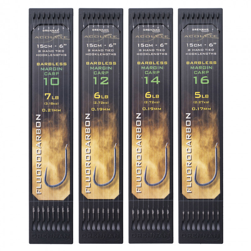 Anzuelos Acolyte de hoja superior con sus puntas ultra afiladas y duraderas, perfectamente montados a mano sobre fluorocarbono Acolyte. Este revolucionario material es súper suave, casi invisible y ofrece una excelente presentación del cebo en el anzuelo, lo que sin duda atrapará más peces.