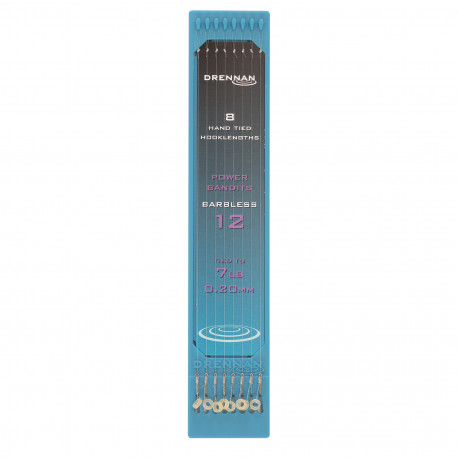 Los anzuelos Barbless Power Hair Rigger utilizados en estos bajos de línea Power Bandit tienen un ojal invertido, lo que coloca el anzuelo recto en el bajo de línea, mejorando la presentación y el enganche. El ojal se puede estirar alrededor de los pellets o introducir en pellets perforados y cebos blandos como maíz y carne, con una aguja para cebos.