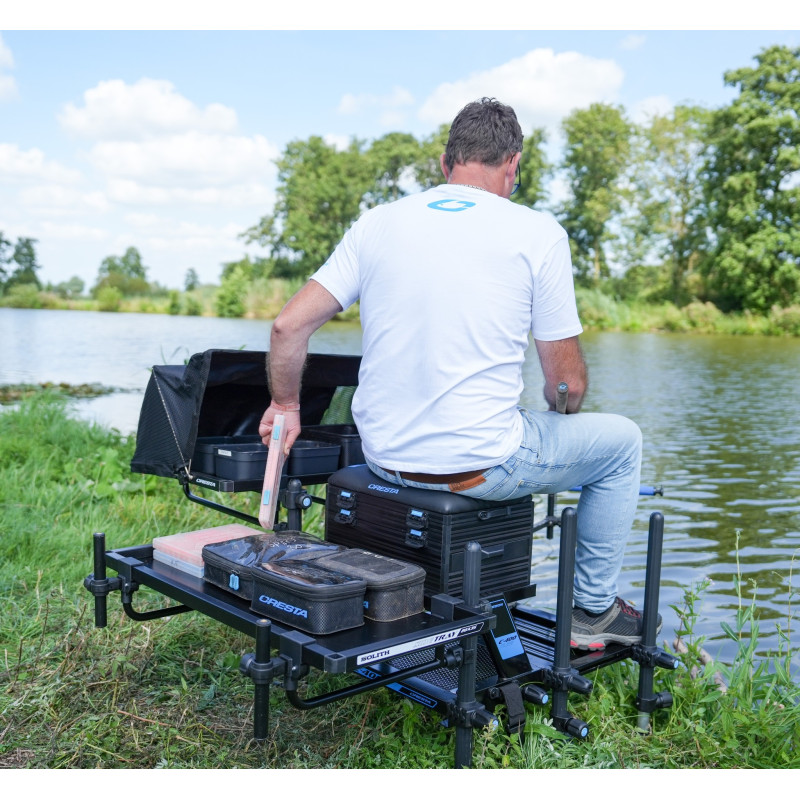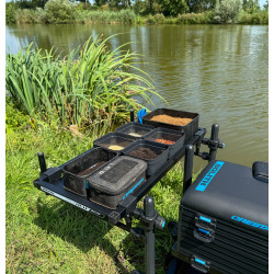 Les dimensions intérieures permettent d'accueillir 8 grands boite à appâts, mais sont également idéales pour placer d'autres accessoires tels que des boîtes à bas de ligne, des bacs d'amorce, etc. à portée de main. Sur l'extérieur, deux tiges filetées amovibles permettent de fixer un support de kit ou tout autre accessoire.
