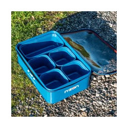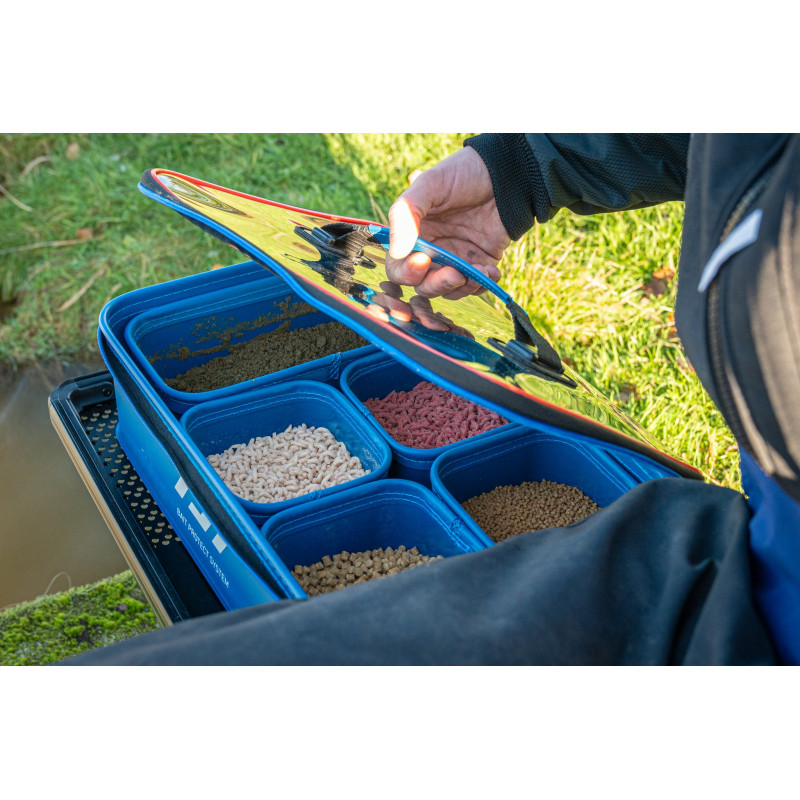 The 9-litre main container can be used to hold groundbait or to protect tackle from the elements thanks to its transparent lid.