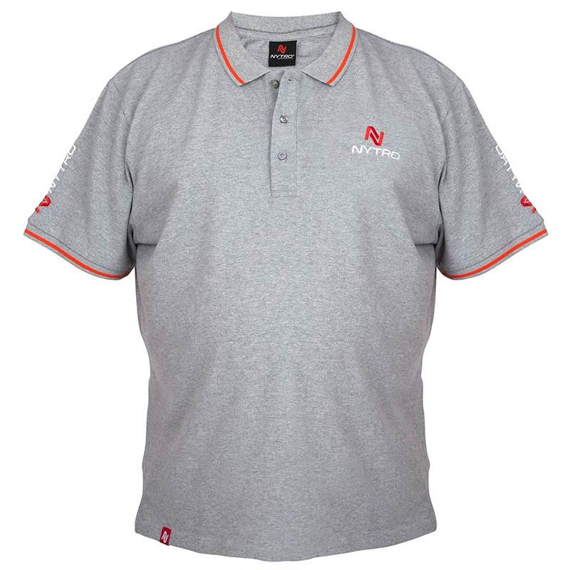 A stylish light grey polo shirt with a comfortable fit, embroidered logo on the front and red trim on the neck and short sleeves.
