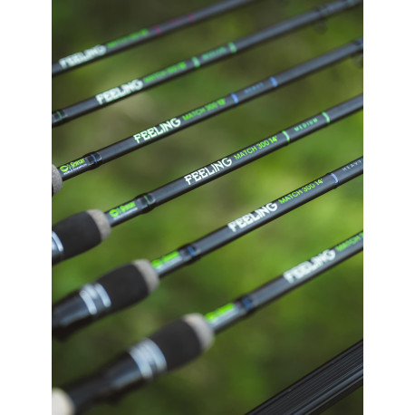 Canna Sensas 300 Feeling Match in versione media, ideale per la pesca a lungo raggio o per la pesca di pesci di grossa taglia. Lunga 3,90 m o 4,20 m, questa canna è in grado di gestire ondulanti fino a 20-25 g di peso.